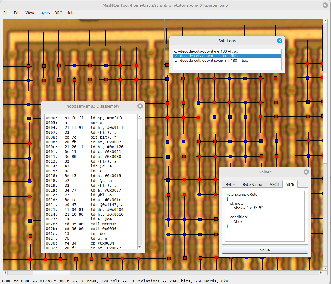 The contents of a mask-programmed ROM can be extracted by photographing the chip's die and marking the row and column lines, the intersections of which are the bit positions. That gives us the bits in physical order, but better tools are needed to reverse engineer the ordering of those bits as logical bytes.